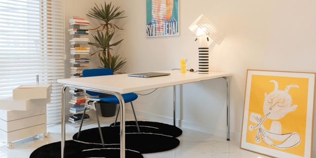 먼저 위에 보이는 개인 공간은 흔히 볼 수 있는 미드 센츄리 스타일로 꾸미기 보다는 블루와 옐로우의 밝은 원색의 강한 컬러감을 사용해서 전체적으로 키치하고 팝한 느낌을 주었고 곧 더워질 계절감을 고려해서 아트위크도 여름 느낌이 나는 제품으로 선택했어요.