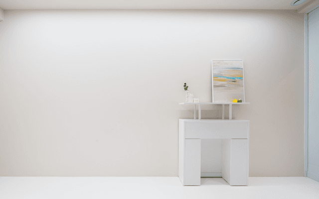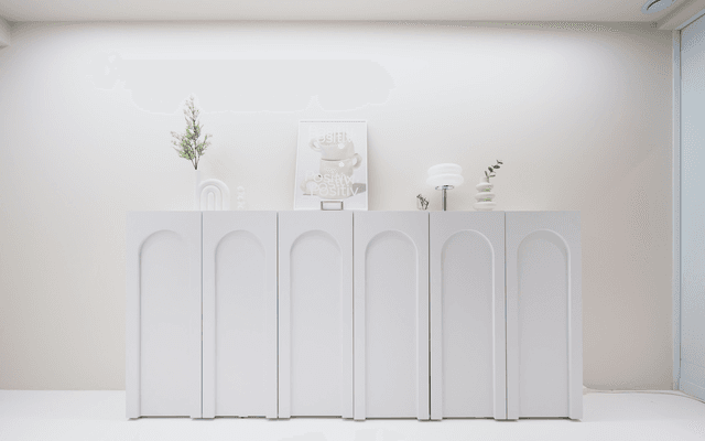 촬영방은 화장품 리뷰를 자주 진행하시는 고객님의 라이프 스타일을 고려하여 얼굴과 제품에만 온전히 집중될 수 있도록 색을 배제한 미니멀 화이트톤을 선택했습니다. 또한 화이트라는 색상이 주는 단조로움을 피하고자 화병과 조명 등은 무게감 있으면서 볼륨감과 형태감이 살아있는 오브제를 선택하여 공간에 위트감과 리듬감을 주었습니다. 오브제들의 전체 톤이 밝은 화이트, 샌드 베이지 등의 톤으로 이루어져 있어 배경이 지저분하지 않습니다.